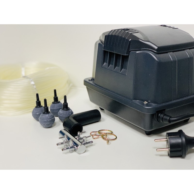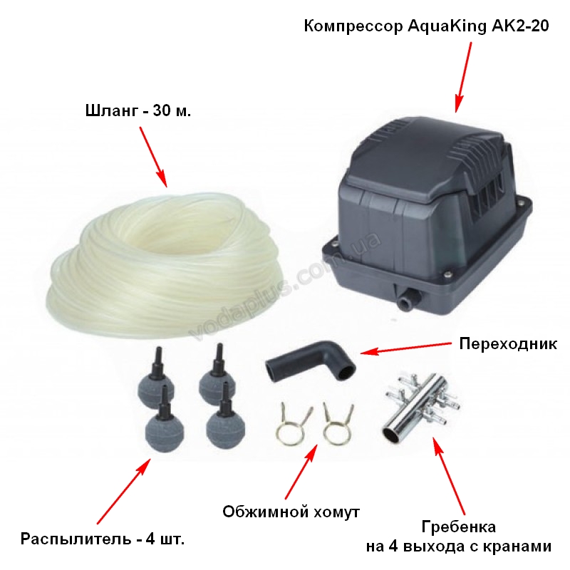 Якщо ви шукаєте аератор, ціна якого доступна, а робочі параметри оптимальні, зверніть увагу на модель Aquaking Set AK²-20. Аератор використовується для водойм з об'ємом води до 12000 літрів. Встановлюється на березі біля водойми і подає повітря за допомогою гребінки з кранами і шланга на розпилювачі, які потрібно розмістити під водою. Цей простий і надійний пристрій допоможе створити ідеальні умови в вашій штучній водоймі для підводних мешканців і рослин як влітку так і взимку, насичуючи воду киснем.