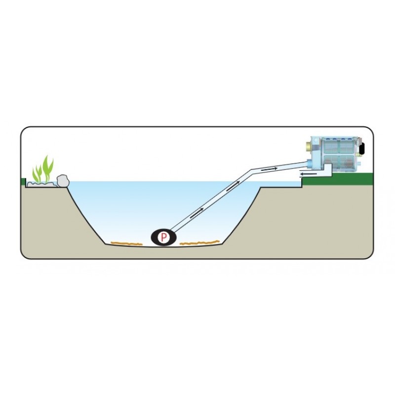 Барабанний фільтр (УЗВ) Filtreau Drum-Filter incl. UVC 40 W (напірного типу) призначений для первинної обробки води з метою видалення зі ставка дрібних забруднень до 70 мк. Коли фільтр екрану заповнений брудом, водоростями і т. д., пропускаємість сита впаде і це призведе до зниження рівня води в чистій камері фільтра Filtreau Drumfilter. Це буде виявлено і автоматично перемкне фільтр Filtreau Drumfilter в режим очищення. «Режим очищення» означає, що сито барабана буде повністю очищено і весь бруд буде змито в каналізацію.