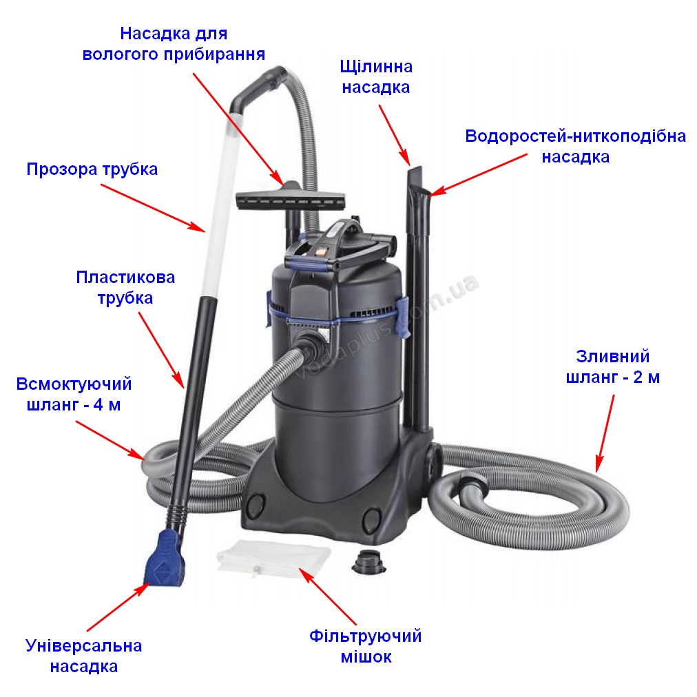 1) Всмоктувальна пластикова трубка - 4 шт; 2) Фільтрувальний мішок - 1 шт; 3) Всмоктуючий шланг - 4 м; 4) Зливний шланг - 2 м; 5) Насадки - 4 шт.