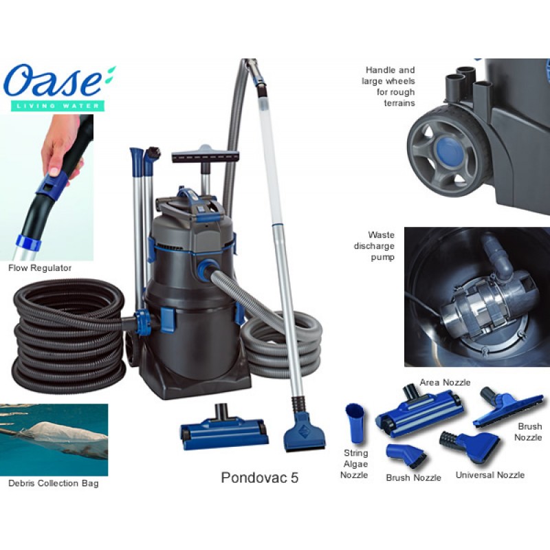 Мулосос для водойми (ставка) OASE Pondovac 5 служить для очищення стін і дна водойм від різних забруднень, включаючи мул, залишки різних рослин і екскременти риби. Мулосос, з потужністю всмоктування 8000 л/год і двигуном 1700 Вт, здатний обслуговувати водойми глибиною до 2,5 метра. Наявність двох камер сприяє безперервній роботі мулососа, оскільки в процесі використання однієї ємності, можна спустошувати іншу. OASE Pondovac 5 - це комплект обладнання для повноцінного чищення ставка.