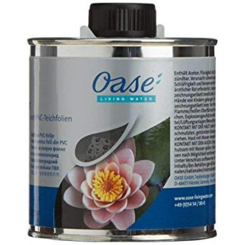 Клей від німецького виробника Oase використовується для склеювання полотен плівки ПВХ між собою, а також для ремонту пошкодженої плівки шляхом приклеювання латки. Поверхня плівки в місцях приклеювання повинна бути сухою і чистою. Зразкова витрата клею 50 мл на 1 метр шва.