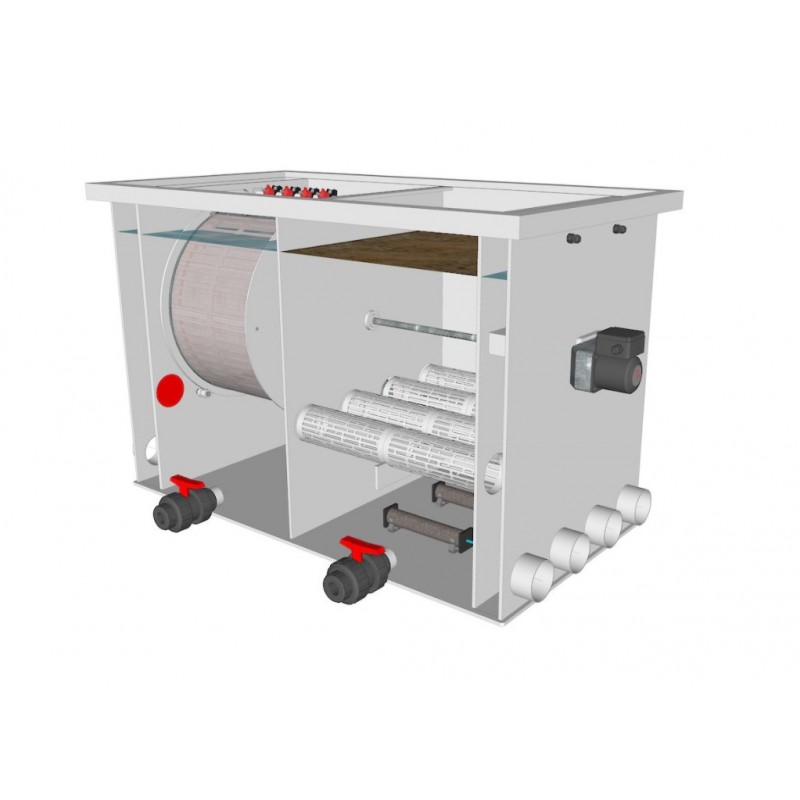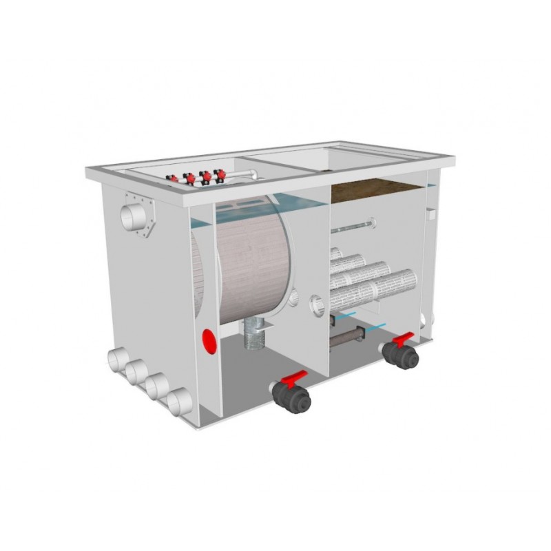 Комбінований фільтр Red Label 50/55 має пропускну здатність до 55 м³. Комбінований фільтр об'єднує барабанний фільтр Red Label і біологічний фільтр в одному пристрої. Барабанний фільтр - це блок механічного очищення, здатний фільтрувати дрібні забруднення до 70 мікрон. Коли фільтр екрану заповнений брудом, водоростями і т. д., пропускаємість сита впаде і це призведе до зниження рівня води в чистій камері фільтра. Це буде виявлено і автоматично перемкне фільтр в режим очищення. «Режим очищення» означає, що сито барабана буде повністю очищено і весь бруд буде змито в каналізацію. Через кілька секунд сітка барабана буде чистою і знову пропустить достатню кількість води, тому фільтр автоматично переключиться назад в режим фільтрації. Це означає, що система повністю автоматизована.