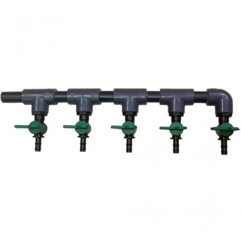 Кран для розпилювача на 5 виходів призначений для установки між компресором і розпилювачем. Він дозволяє регулювати потік повітря яке надходить у ставок. Кран виготовлений з якісного пластику. Діаметр підключення подачі повітря на роздільник - 20 мм. Діаметр підключення повітряних шлангів - 16 мм.
