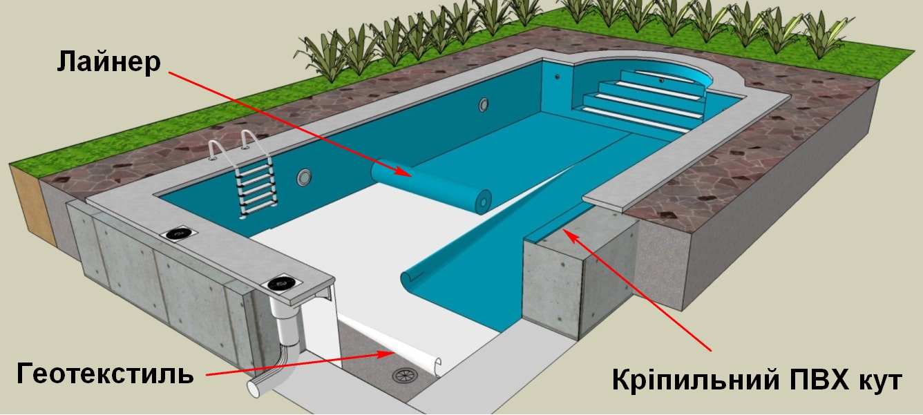 Монтаж плівки ПВХ проводиться шляхом укладання та спайки гарячим повітрям формою чаші басейну. Кількість матеріалу розраховується індивідуально, залежно від розміру та глибини басейну, а також наявності сходів. Щоб правильно прорахувати потрібну кількість матеріалів для обробки Вашого басейну, зверніться до наших спеціалістів.