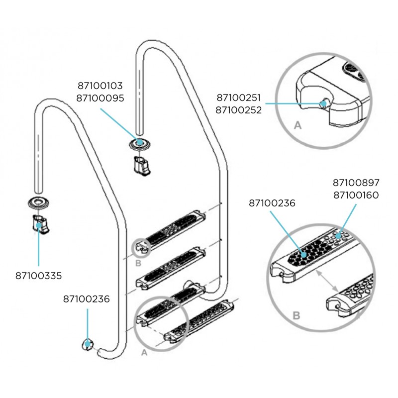 Внизу сходи упираються в стіну басейну прогумованими заглушками, щоб не порушувати гідроізоляцію чаші. Кількість сходів підбирається залежно від глибини басейну. Чим більше сходів, тим на більшу глибину розрахована конструкція. Драбина Flexinox Overflow може використовуватись як у домашніх, так і в комерційних басейнах.