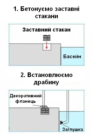 Кріплення до борту басейну здійснюється за допомогою пластикових заставних стаканів (у комплекті), які потрібно забетонувати.