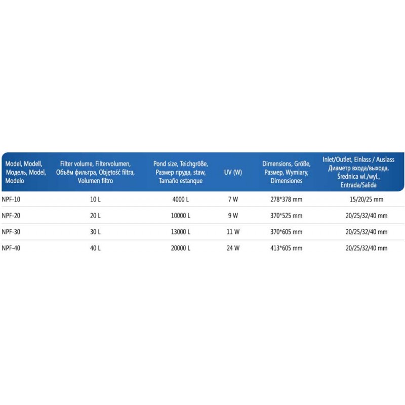 Напірний фільтр AquaNova NPF 30 підходить для якісної очистки штучної водойми об'ємом до 15000 літрів. У комплект входить вбудована ультрафіолетова лампа потужністю 11 Вт.