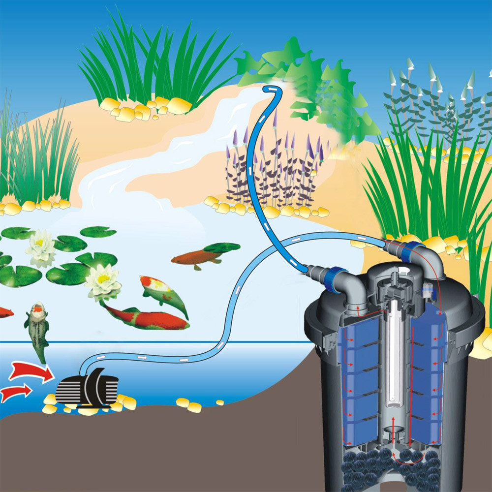 За допомогою насоса вода потрапляє в фільтр, проходить очистку та повертається назад у водойму. Герметичний корпус дає нам можливість встановлювати фільтр як вище, так і нижче рівня поверхні води. Наприклад, фільтр можна частково прикопати на березі біля ставка, а очищену воду подати на декоративну гірку або струмок.