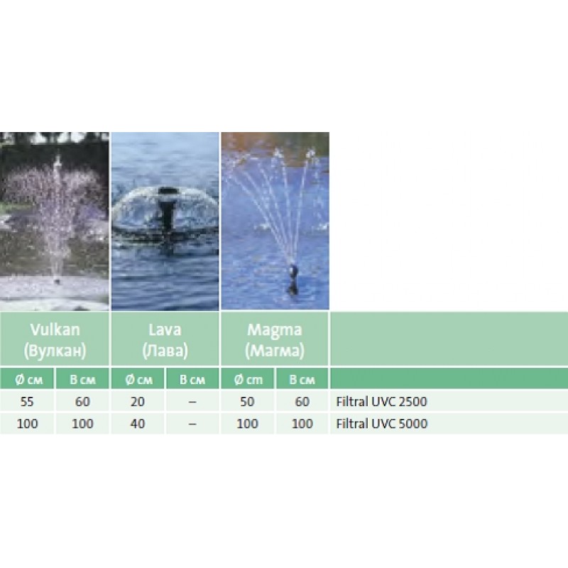Фільтраційний насос для ставка OASE Filtral UVC 5000 з УФ-лампою потужністю 11 Вт пропонує повний комплекс очищення води для штучних водойм і ставків об'ємом до 5000 літрів. Установка фільтра виконується на дні водойми. Вода після фільтрації використовується для створення фонтану з регулюванням рівня підйому. В комплекті три фонтанні насадки.