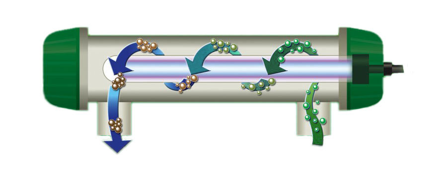 Головна особливість фільтра SunSun CBF 350 B-UV - це вже передбачена комплектацією, УФ лампа, потужністю 24 Вт. Потік води при проходженні через фільтр спочатку потрапляє в відсік з УФ лампою. Одноклітинні водорості, що викликають «цвітіння» води і інші небажані мікроорганізми, в тому числі патогенні, руйнуються вже при вході в фільтр. УФ випромінювання руйнує водорості і бактерії при проходженні через відповідний відсік фільтра, тобто їх кількість залишається під контролем. Очищена від мікроорганізмів вода потрапляє в такі відсіки, де проходить вже механічну та біологічну очистку. Термін служби УФ лампи від 7000 до 10000 годин, тому, для коректної роботи УФ очищення, ми рекомендуємо заміну ламп щороку разом з очищенням скляної колби від нальоту і слизу.