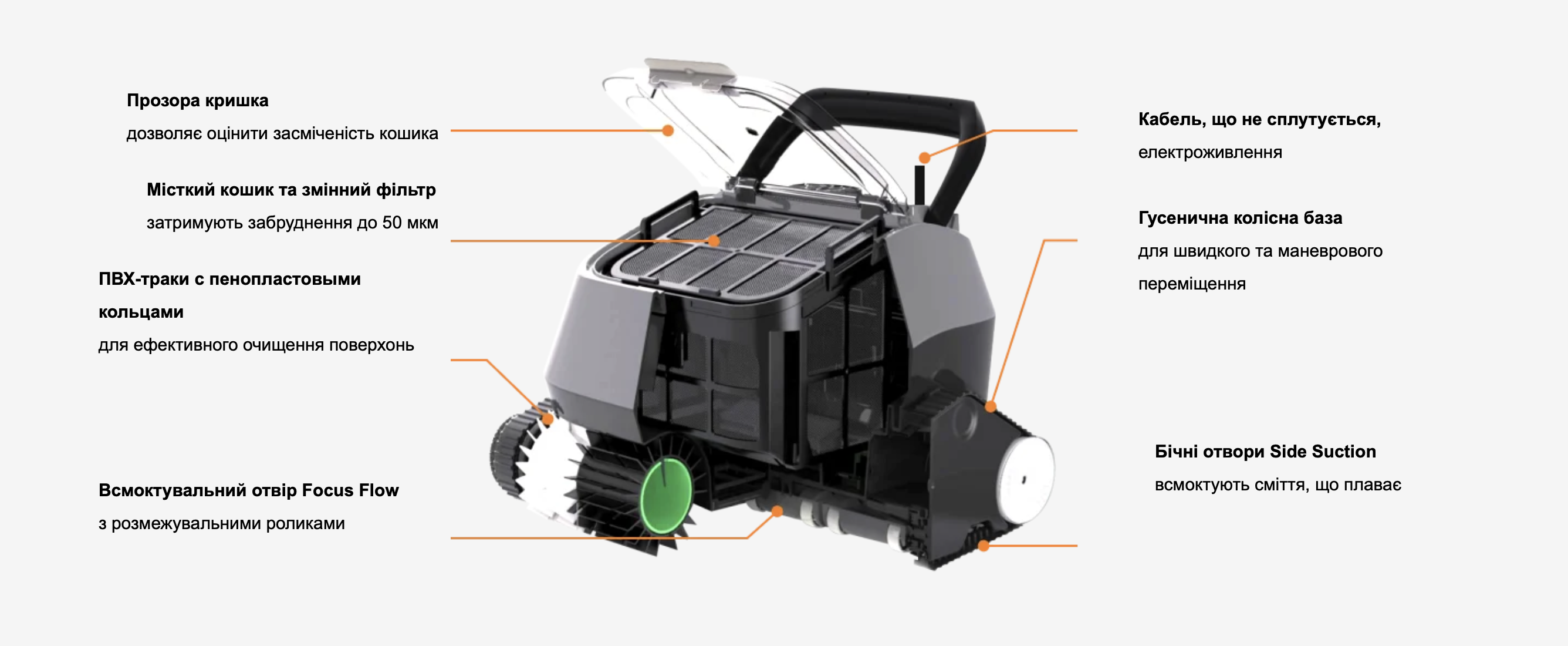 Технології Focus Flow і Side Suction забезпечують потужне та економічне всмоктування. Focus Flow концентрує потік на вузькій смузі, а Side Suction збільшує ширину захоплення сміття завдяки бічним отворам.