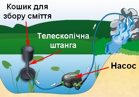 Робота скімера проводиться разом з окремо встановленим насосом для очищення ставка. Потужність прокачування води насосом рекомендується на рівні 4500 літрів на годину. Монтаж скімера здійснюється закріпленням його на дні штучного озера і підключенням з насосом за допомогою шланга. Регулювання скімера до рівня води проводиться за допомогою телескопічної штанги.