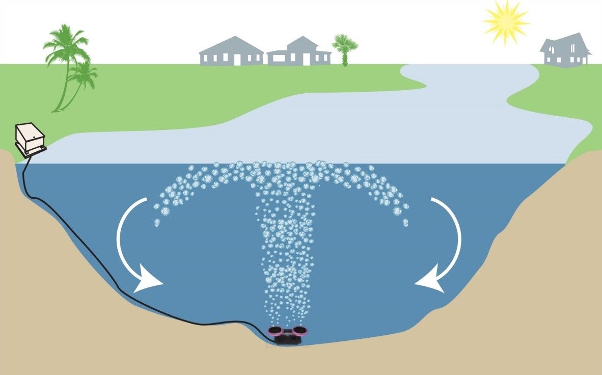 Процес збагачення водойми киснем здійснюється завдяки змішуванню води і повітря під напором. Крім цього, аератор допомагає перемішувати воду з різних верств водойми і рівномірному її прогріванню.